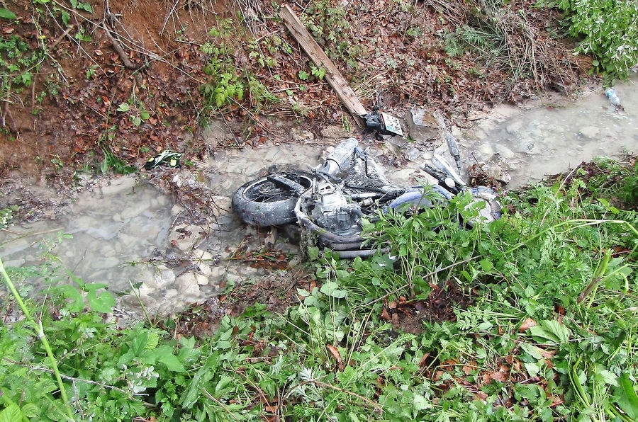 V soboto od 15:30 uri je motorist med vožnjo po cesti v levem ovinku na cesti pred seboj nenadoma zagledal srno. Za preprečitev trka je motorist sunkovito zavrl in se umaknil v desno, vendar je pri tem zapeljal s ceste, izgubil oblast nad motorjem ter se ustavil šele v globljem delu potoka ob cesti.