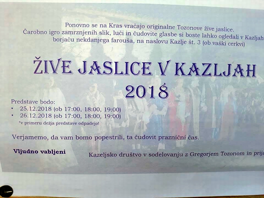 Poleg Postojnske jame, kjer je uprizoritev živih svetopisemskih podob že tradicija, pa te oživljajo tudi domačini na Krasu. Tako je bila v Kazljah predstavljena živa svetopisemska zgodba s pravimi igralci, ki so obiskovalce popeljali v davni svet Jezusovega rojstva.