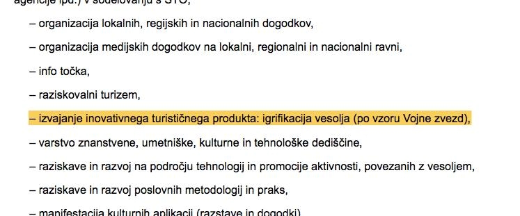 Med nalogami zavoda, zapisanimi v državni listini ustanovnega akta je tudi izvajanje inovativnega turističnega produkta: igrifikacija vesolja (po vzoru Vojne zvezd).