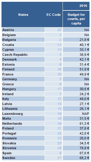 V letu 2016 je prek davkov vsak davkoplačevalec za Slovensko sodstvo odštel 78.8 €, kar Slovenijo uvršča v sam vrh proračunskih sredstev namenjenih za sodišča. Tako se uvrščamo pred Švedsko (68.2 €), Španijo (67.6 €) in Nizozemsko (61.3 €) na prebivalca.