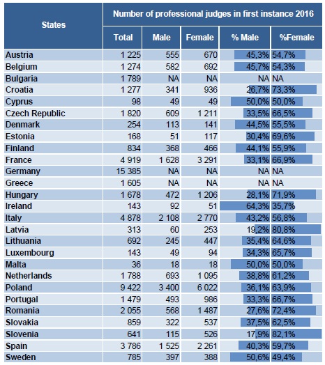 Dodatna neenakost Slovenskega sodstva pa je tudi razdelitev sodniških halj glede na spol. Slovenija je edina država v EU poleg Latvije, ki ima tako neproporcionalno razporejeno sodno delo po spolu.
