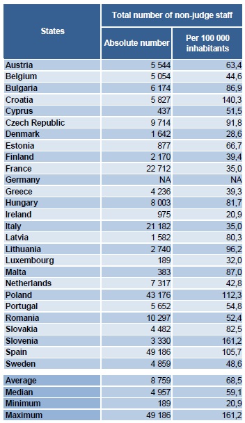 Tudi po številu zaposlenega sodnega osebja brez sodnikov, je Slovenija ponosna zmagovalka, saj imamo na 100 tisoč prebivalcev kar 161 zaposlenih na Slovenskih sodiščih. Za primerjavo, Hrvaška (140), Poljska (112), Danska (28), Irska (20).