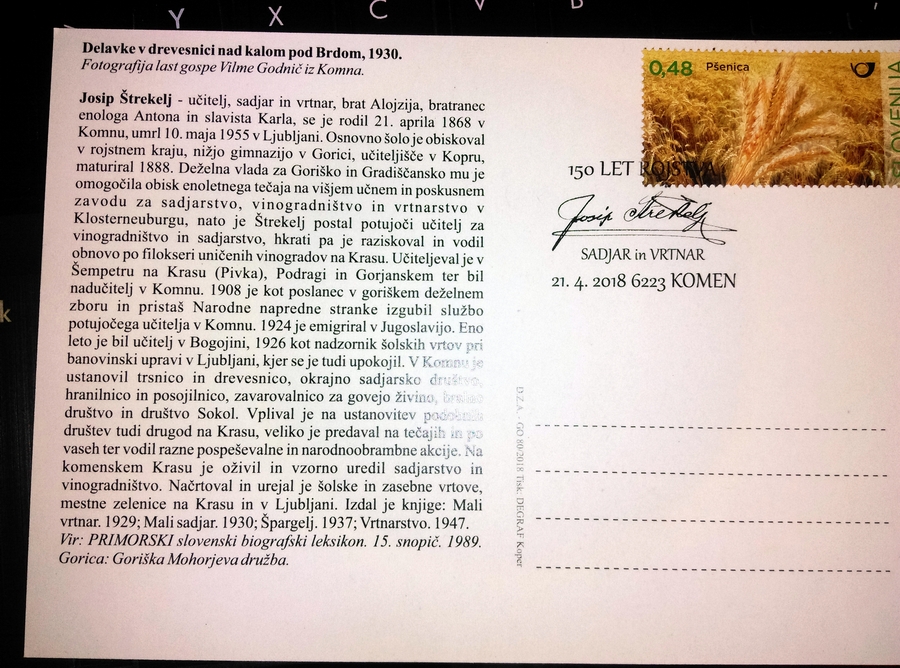 V knjižnici Srečka Kosovela, pe Komen so v petek predstavili razglednico in priložnostni žig Pošte Slovenije ob slovesni obletnici. Josip Štrekelj, ki se je rodil v Komnu 21. Aprila 1868, je bil poznan kot učitelj, predvsem pa kot sadjar in vrtnar. Zaslužen je za ustanovitev drevesnice, sadjarskega društva, hranilnice, zavarovalnice ter bralnega društva in društva Sokol. Njegov vpliv pa je bil odločilen za ustanovitev podobnih organizacij in društev tudi drugod po Krasu.